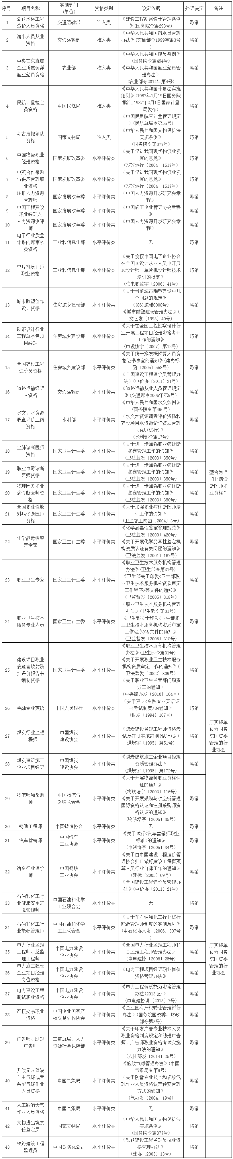 一、取消的专业技术人员职业资格许可和认定事项(共计43项,其中准入类5项,水平评价类38项)