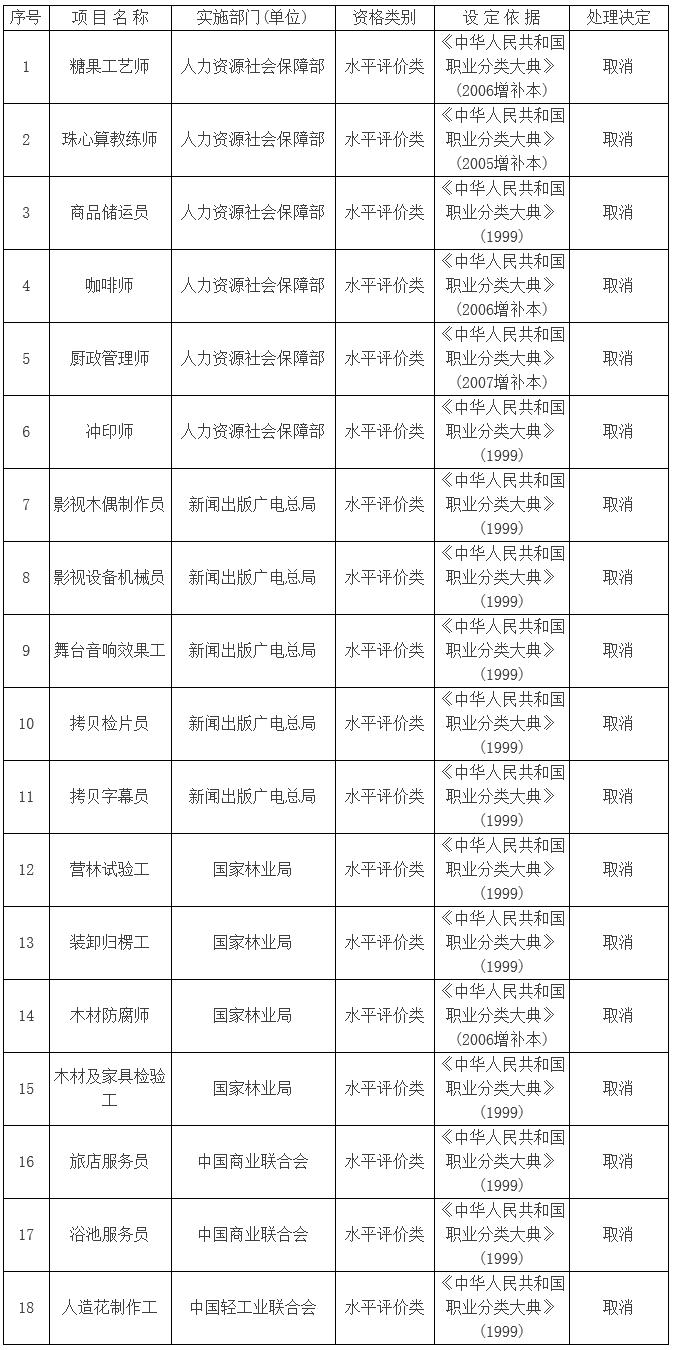 二、取消的技能人员职业资格许可和认定事项(共计18项,均为水平评价类)
