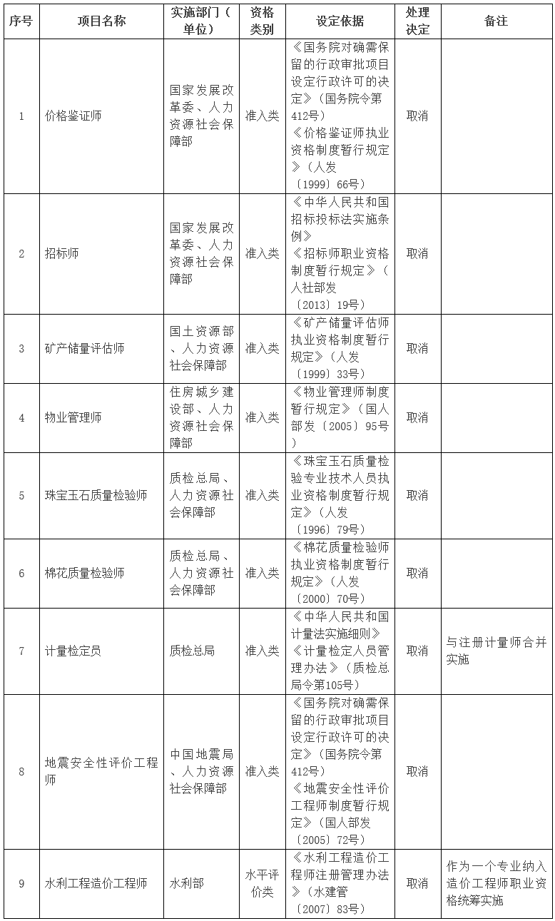 一、取消的专业技术人员职业资格许可和认定事项(共计9项,其中准入类8项,水平评价类1项)