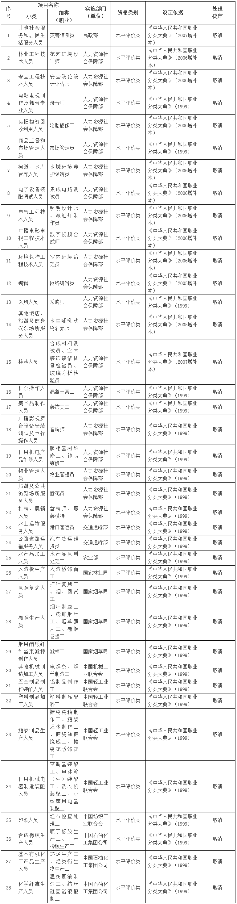 二、取消的技能人员职业资格许可和认定事项(共计38项,均为水平评价类)